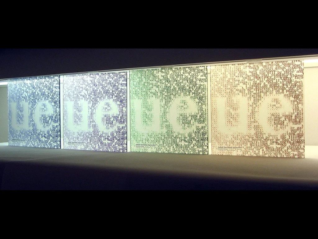 Mural-sized portraits celebrating Ireland’s literary legends are composed through the writers’ most well-known works using a proprietary software program that scales individual characters to replicate the density of an image. GraphicUser and the SOM Graphics group worked directly with programmers to create this custom software that scales individual characters based on the light and dark areas of the source image. The final digital art was output on a clear substrate, glass laminated and installed with back lighting to create an ethereal experience.
