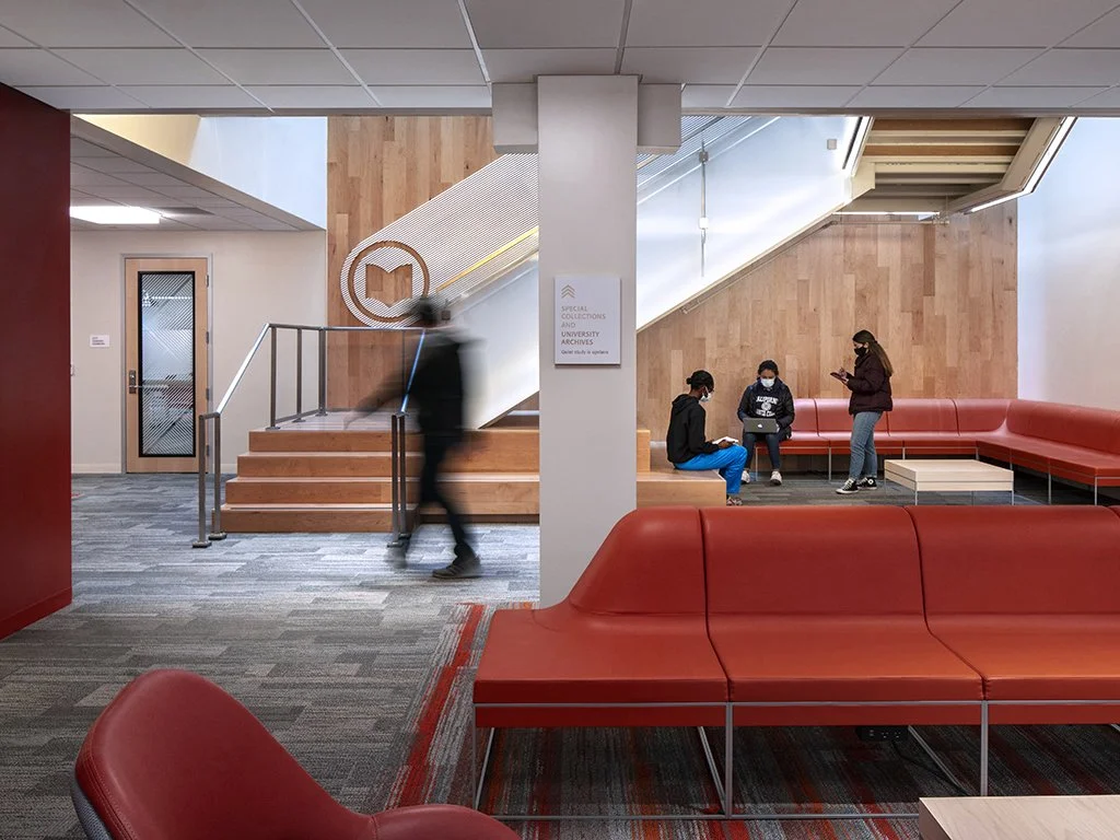 GraphicUser was hired by EHDD Architects to design specialty signage for this 120,000 sf renovation in Turlock, California. Large scale graphics were developed to activate the main circulation and enhance gathering spaces. The approach is energetic and dynamic to support the library’s position as the academic heart of the Stan State Campus.